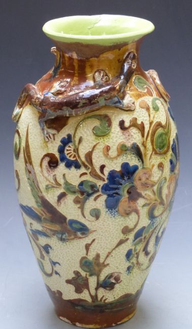 Barum Pottery vase decorated with birds and lizards in relief, height 37cm