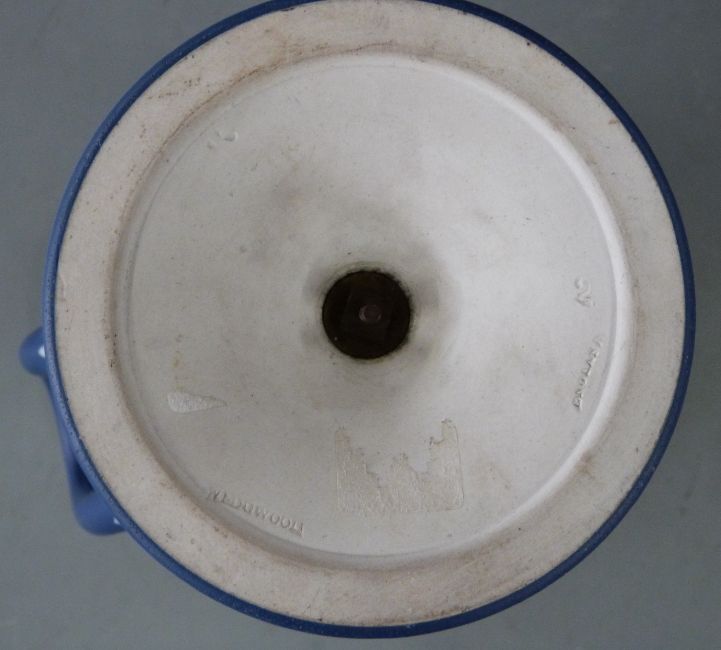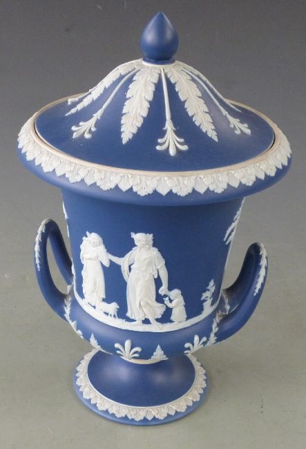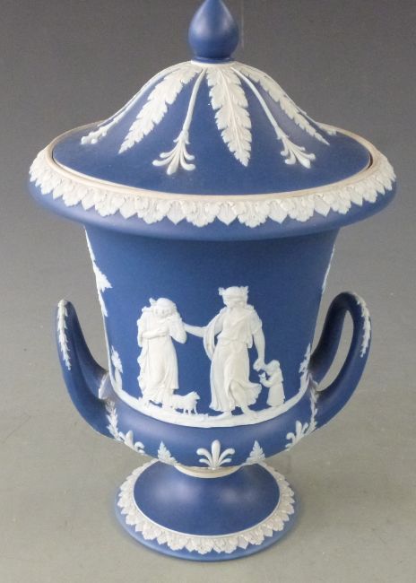 Wedgwood Jasperware twin handled pedestal covered campagna urn, Height 27.5cm