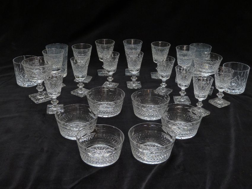 A suite of Edinburgh Crystal glasses comprising eight sherry glasses, six white wine glasses, two pink champagne glasses, two water tumblers and six finger bowls together with a pair of Waterford Crystal whisky tumblers