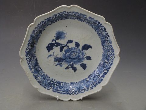19thC Chinese shallow dish/charger with gadrooned rim decorated with a peony and floral border, H4.5cm diameter 30cm