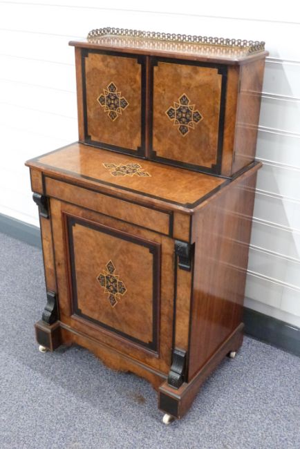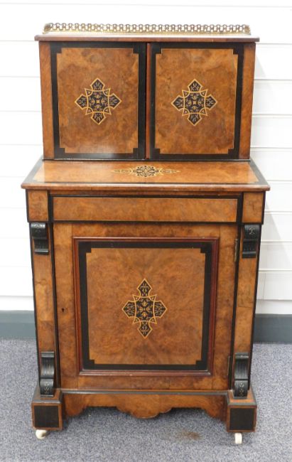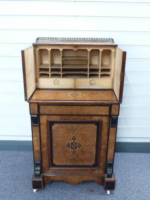 Victorian burr walnut, ebony and inlaid davenport with gilt gallery to top and two doors opening to reveal pigeon holes and drawers, the base having a cupboard revealing shelves with drawer above containing tooled leather writing surface and pen trays, W58 x D41 x H104cm