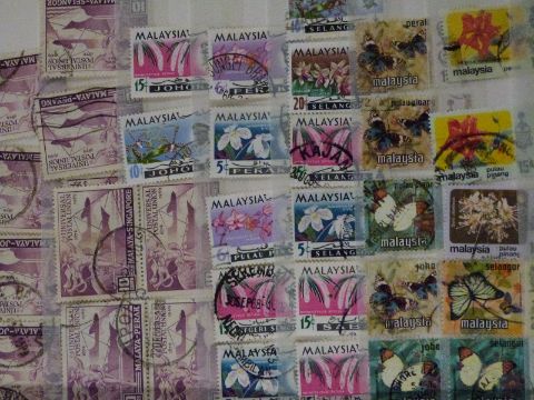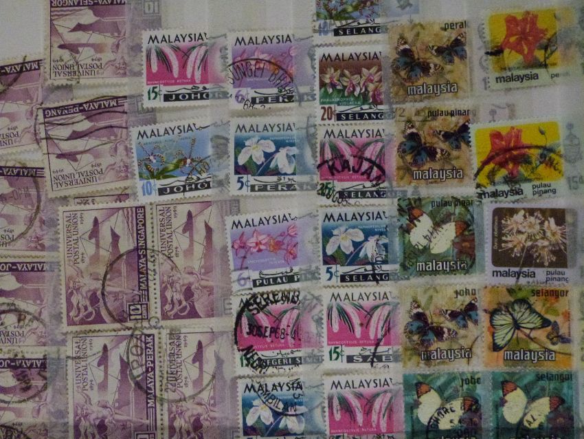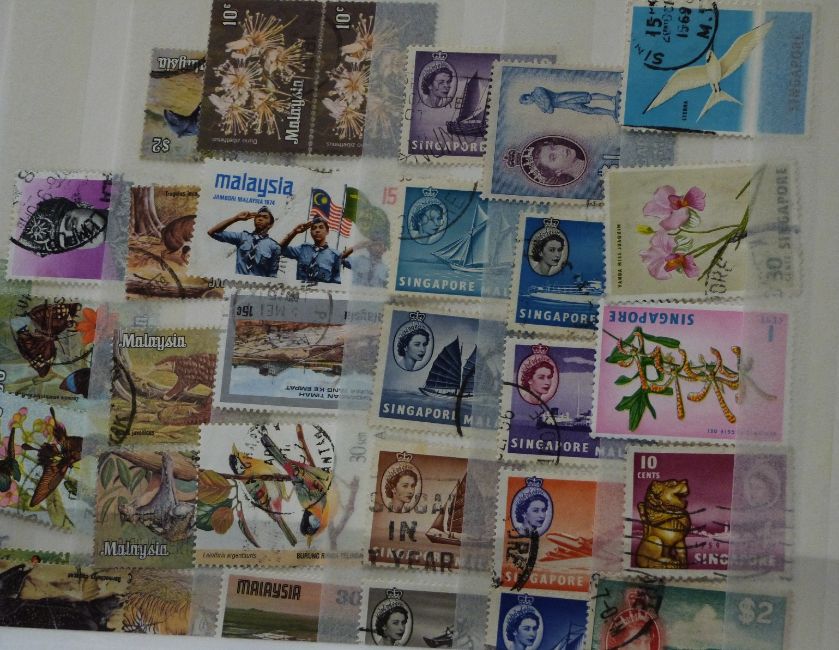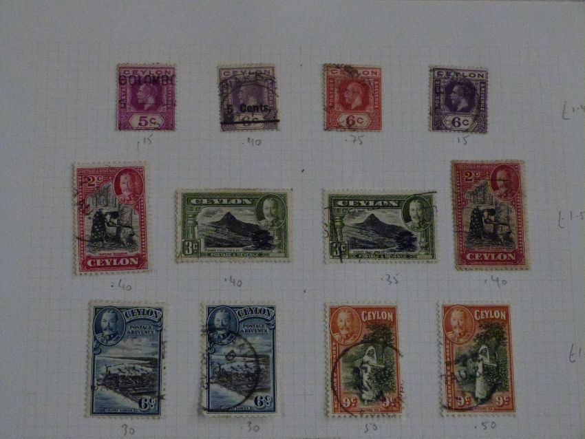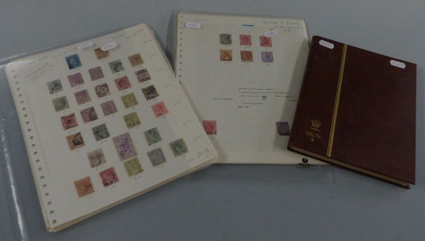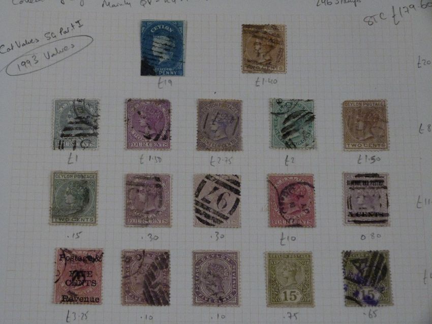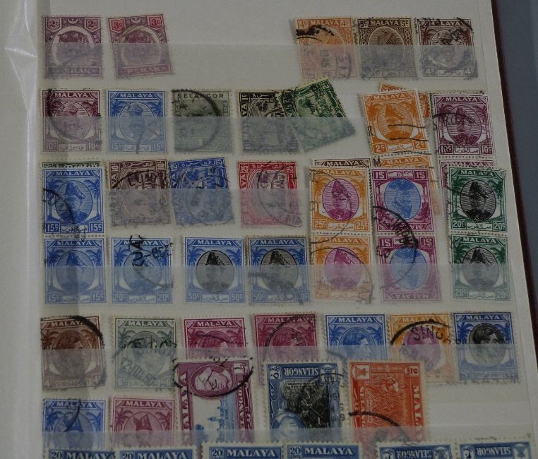 Collections of Ceylon, Mauritius and Malay States stamps on loose album sheets and in a stockbook