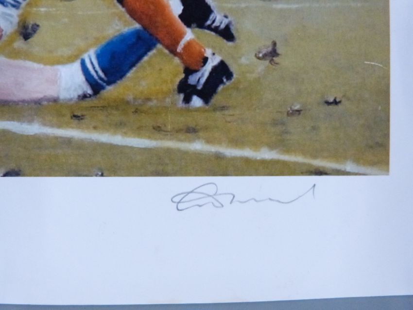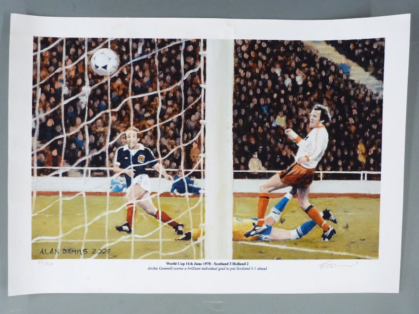 Three Alan Damms limited edition prints, two being World Cup Final 30th July 1966 England 4 - West Germany 2 (aet) Martin Peters Scores to Put England 2-1 ahead one 125/500 signed by Martin Peters and the artist the other 47/500 signed by the artist only, the third World Cup 11th June 1978 - Scotland 3 Holland 2 Archie Gemmill Scores a Brilliant Individual Goal to Put Scotland 3-1 Ahead, signed by the artist, each approximately 30 x 42cm with certificate of authenticity