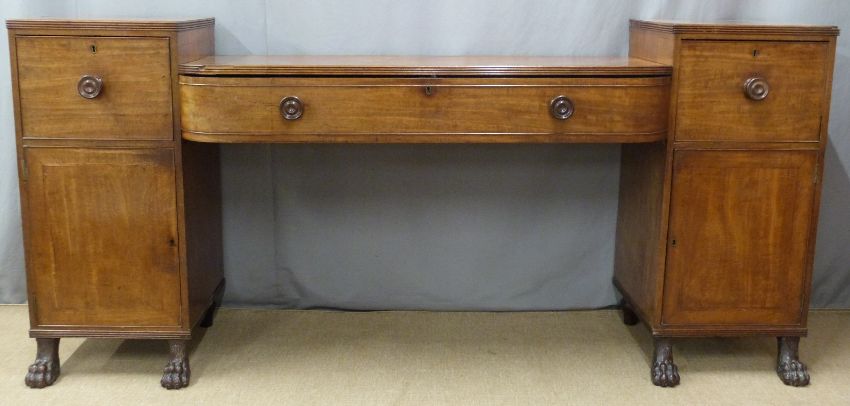 Georgian or Regency mahogany sideboard with three drawers above a cupboard to each pedestal, W241 x D70 x H110cm