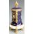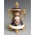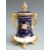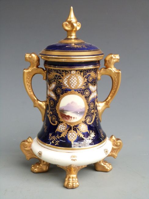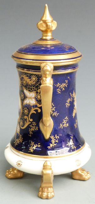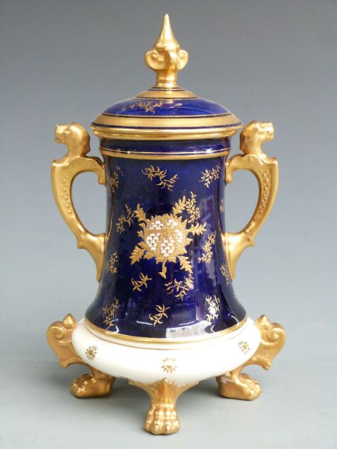 Coalport lidded vase, the four gilt pad feet leading to a tapered body hand decorated cartouche and gilt decoration to the dark blue ground, with gilt handles and gilt finial to lid, H17cm