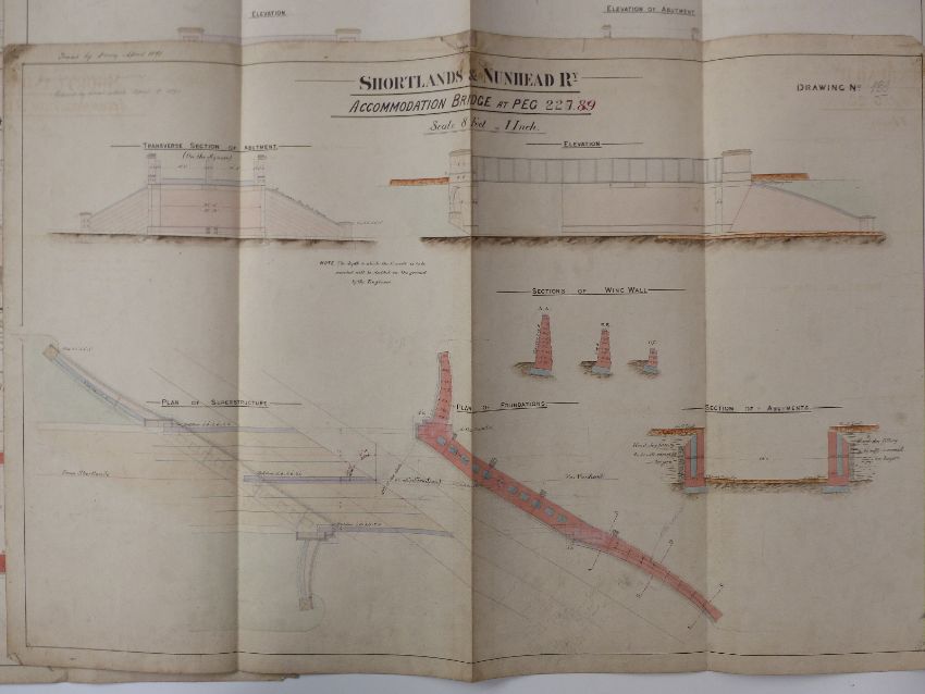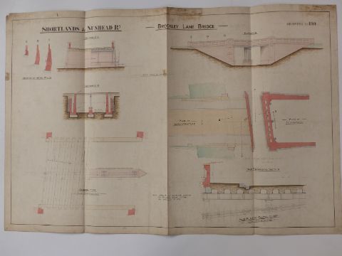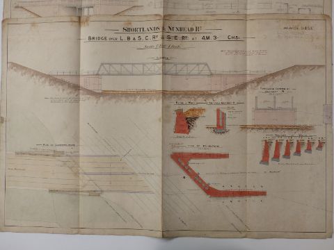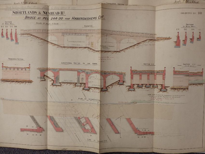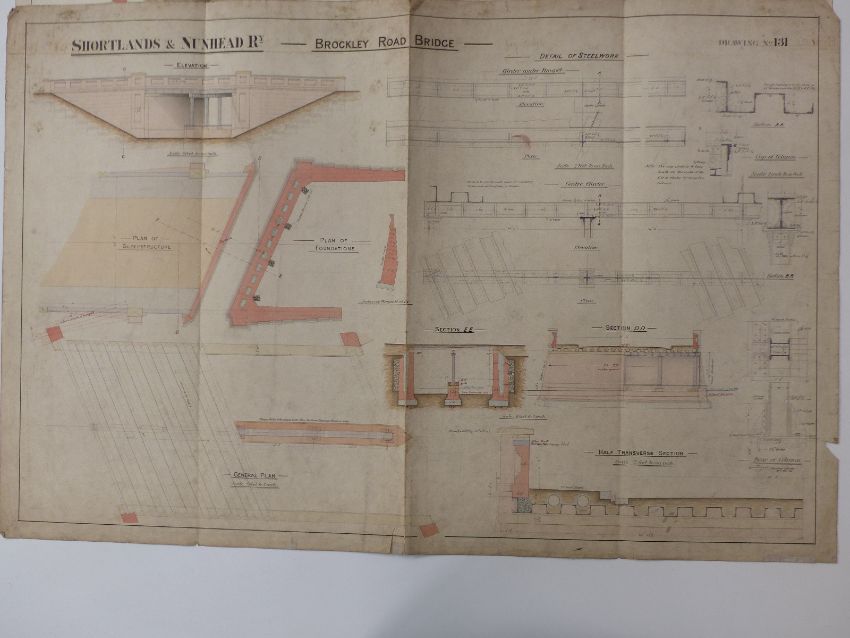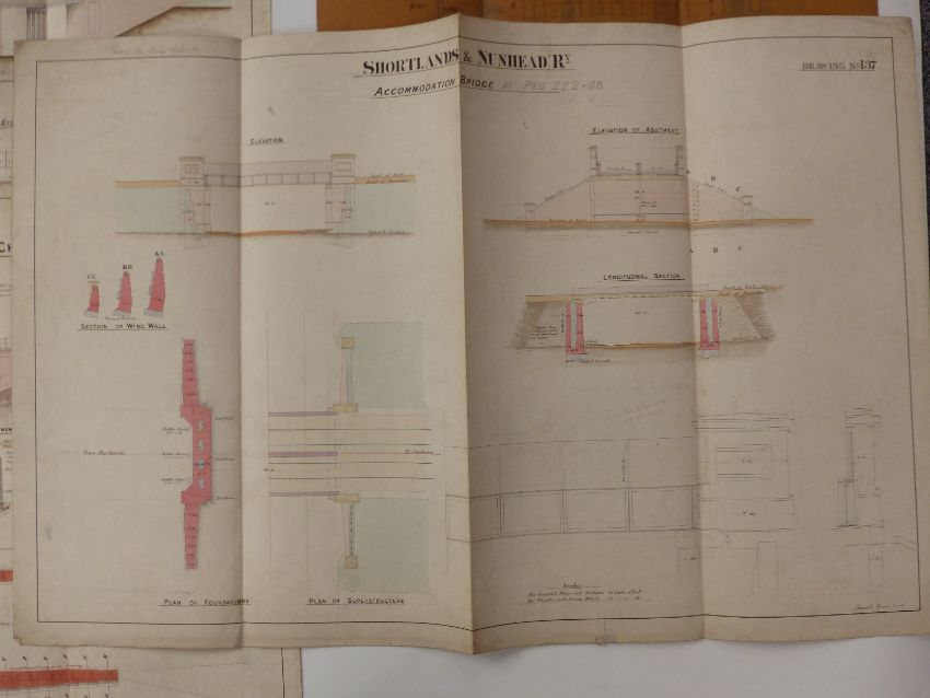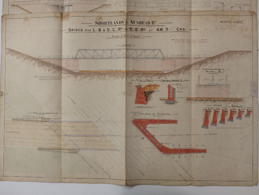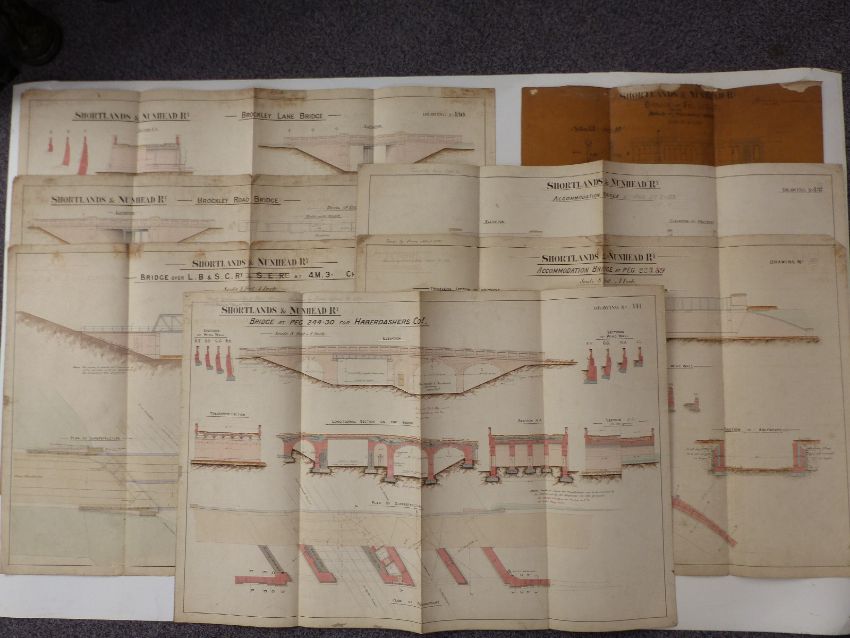 Seven Victorian Shortlands and Nunhead Railway Civil engineering or architect's drawings depicting bridges including one spanning the L.B. & S.C. railway, many dated 1890 or 91, each approximately 64 x 100cm