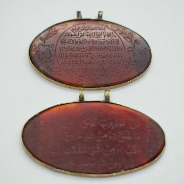 Two carnelian agate pendants with engraved script