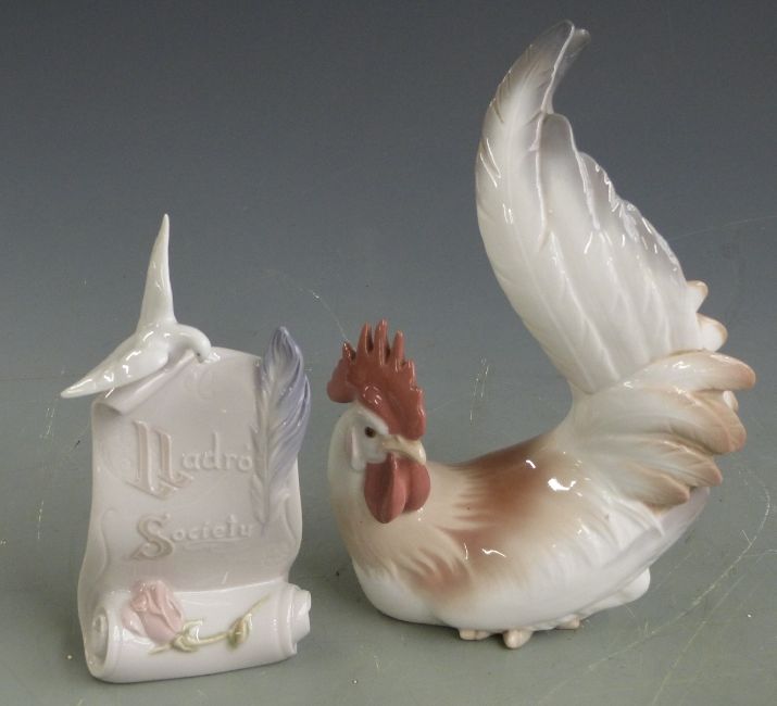 Lladro figure of a cockerel, H23cm and a Lladro Society scroll, H18cm