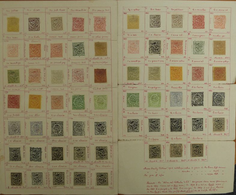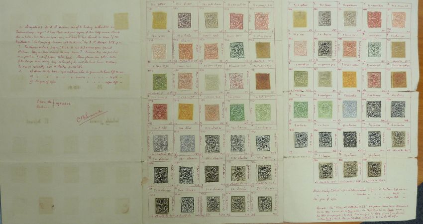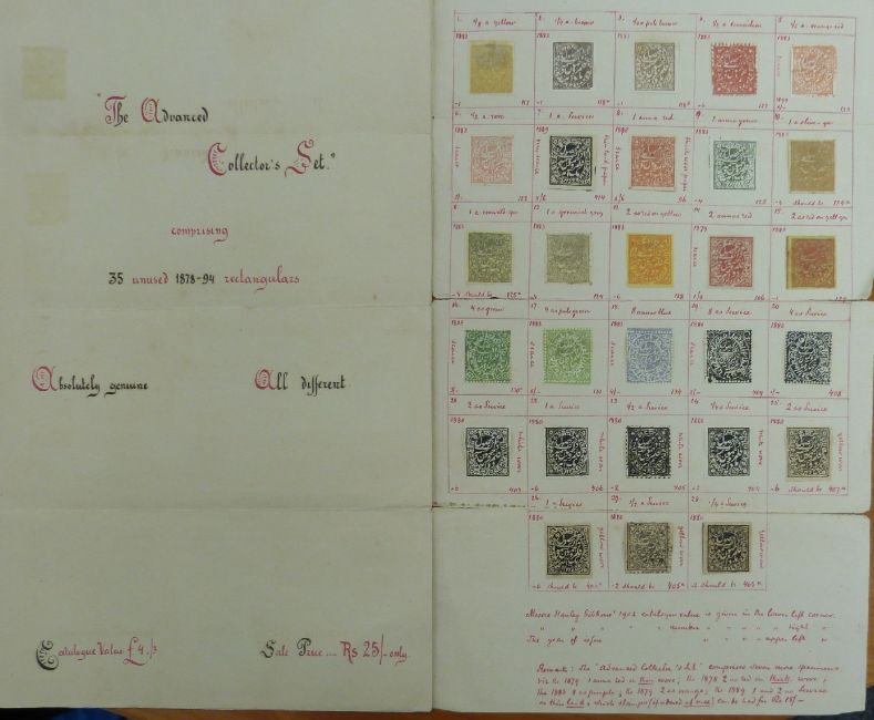 Kashmir - an unusual and interesting lot comprising 63 stamps prepared for sale by a stamp dealer in 1902 and still as originally offered with details and descriptions