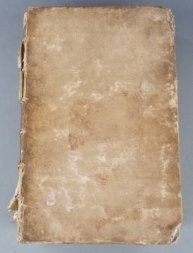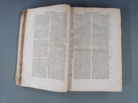Sancti Ambrosii Mediolanensis Episcopi Opera, Ex Editione Romana published Parisiis 1642, title page printed in red and black with engraved illustration, folio bound in worn vellum binding with raised bands. Bookplate of the Rev John Hamilton Grey of Carntyne Co. Lanark
