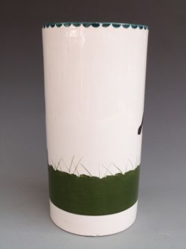The Bristol Cat and Dog Pottery large cylindrical vase hand painted with a  cat and dog scene entitled 'Oh chase me' and signed by Louis Wain H25cm