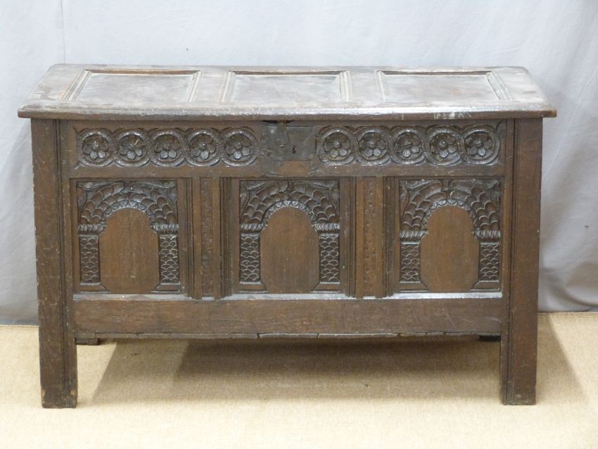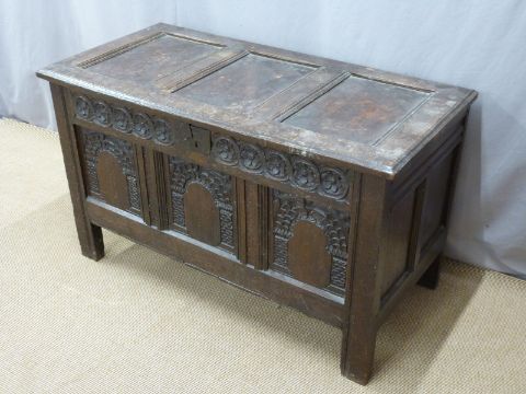 Antique oak coffer with carved, panelled decoration and pegged joints, W120 x D59 x H71cm