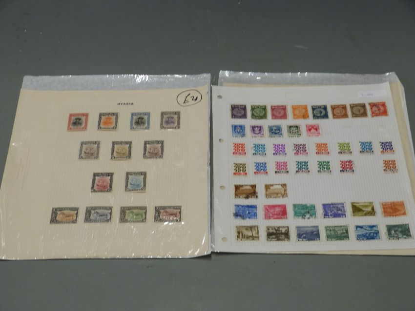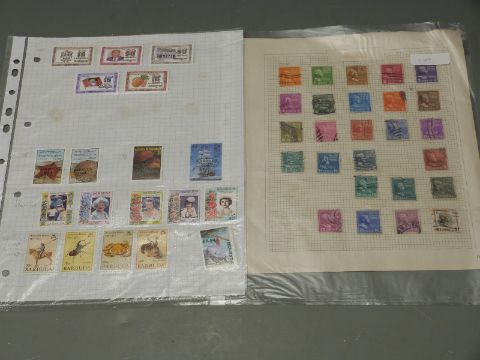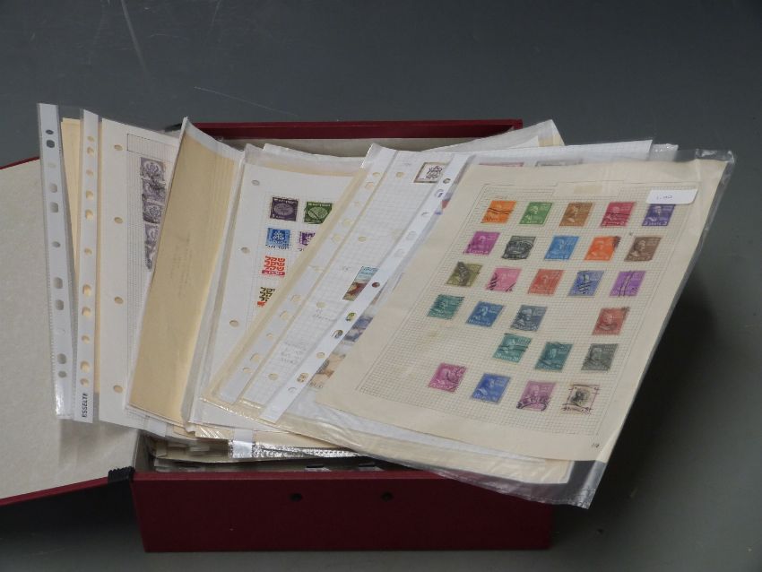 A box file of USA, South America, Asia and other stamps on loose album pages