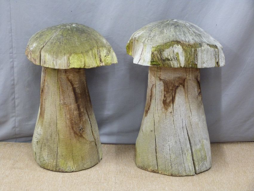 Two carved oak mushroom/ garden ornaments, tallest 77cm