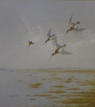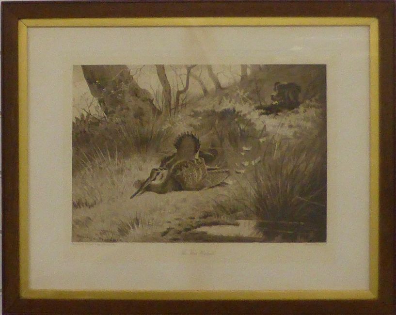 Watercolour study of snipe in flight, 46 x 42cm and an Archibald Thorburn print 'The First Woodcock'