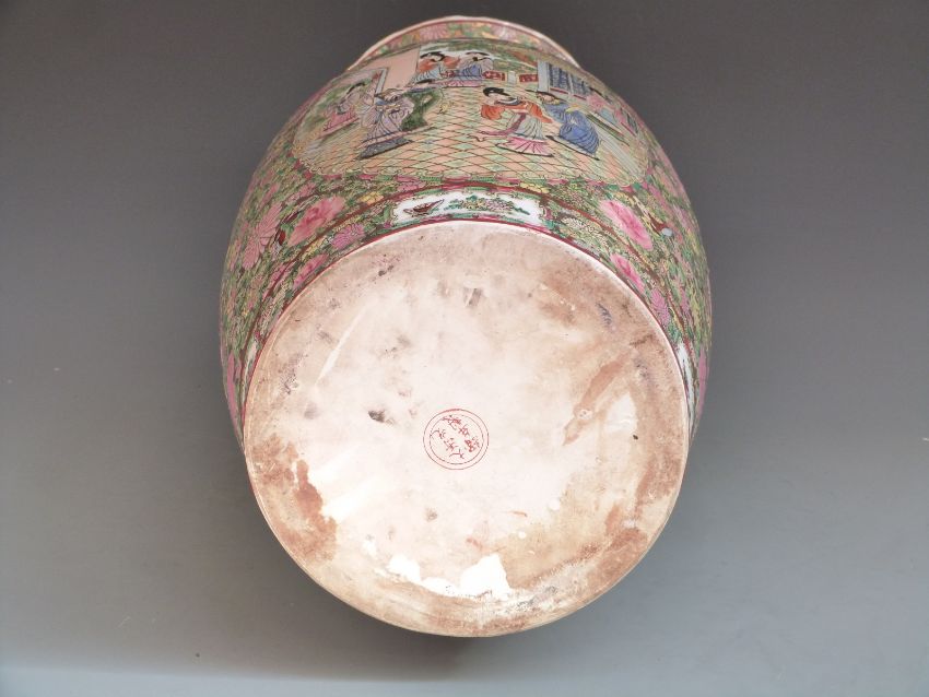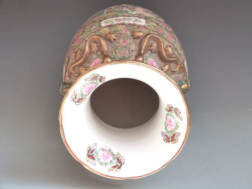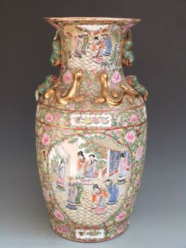 Chinese/Canton ware floor vase decorated with court scenes and relief moulded lizards to the neck H62cm