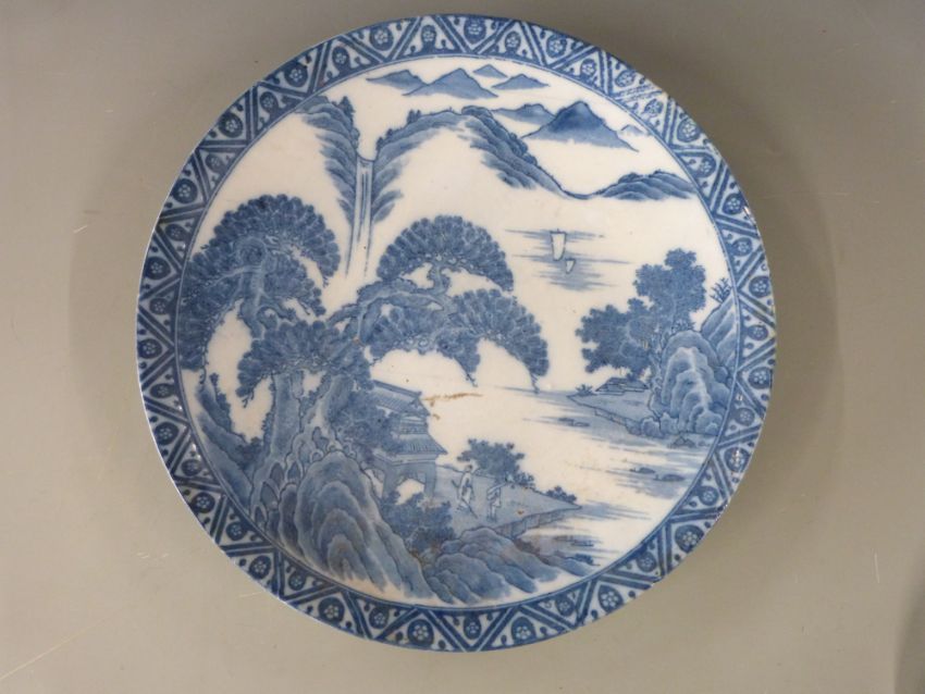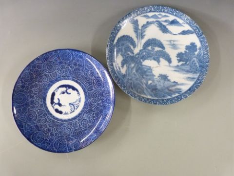 Two 19th/20thC Chinese blue and white chargers with stilt marks to base diameter 36cm