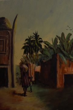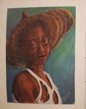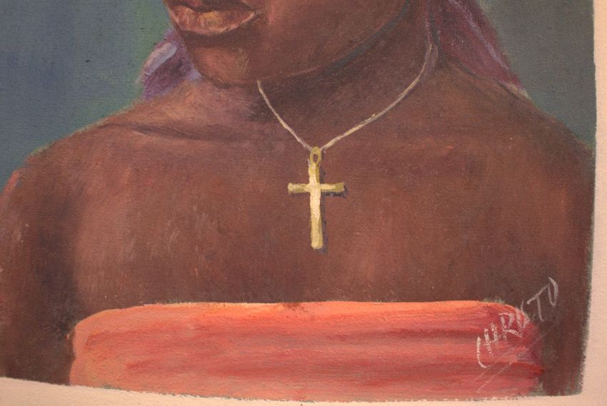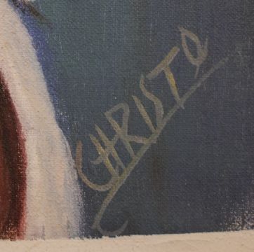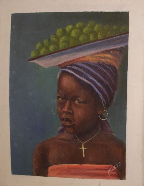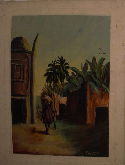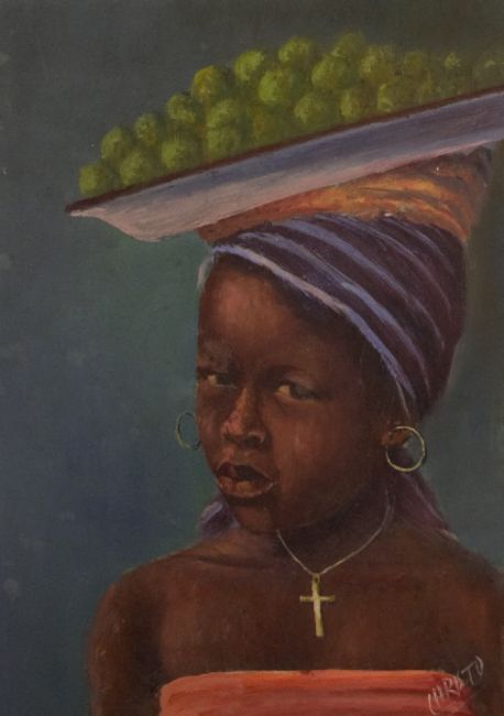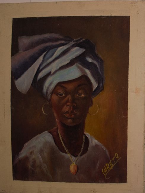 Five African oil on canvas portraits of tribal people and a further example depicting a village scene, each signed Christo, 45 x 35cm