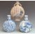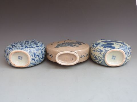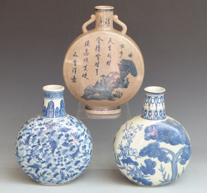 Two Chinese blue and white moon flasks and a Chinese crackle glaze moon flask with script and landscape decoration, tallest 29cm