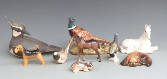 Beswick pheasant, Airedale dog, foal etc Goebel & Lomonosov figures, Helmsdale pottery lapwing etc