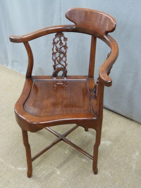 Chinese elm corner chair with pierced splats and shaped back support, H85cm