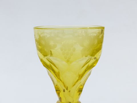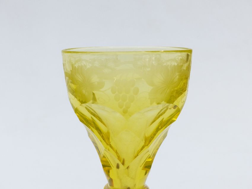 Six John Walsh Walsh wine glasses with uranium style yellow glass bowls cut and engraved with fruiting vines, raised on clear stems, 15cm tall.