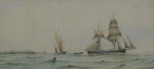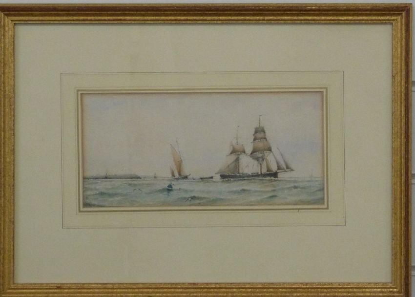 Richmond Markes Victorian maritime watercolour two sailing ships with coast beyond, initialled lower left, 12 x 25.5cm, with Burford Gallery labels verso