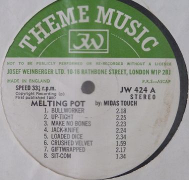 J W Theme Music. Midas Touch. Melting Pot (JW424) John G Tysson and Daniele Prencipe - Electric Light (JW422). 2 copies of each, one with plain white labels. Property of Former Member of Nimbus direct to disc recording studio and bespoke manufacturing at Wyastone Leys, Monmouth