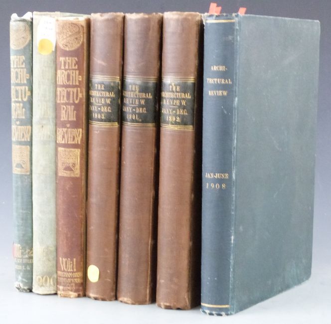 The Architectural Review for 1897, 1900, 1901, 1902, 1903, 1907 and 1908 a collection of bound volumes with contributions by J McNeill Whistler, Sir E.Burne-Jones, Muirhead Bone, etc (7)