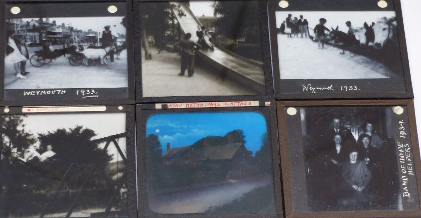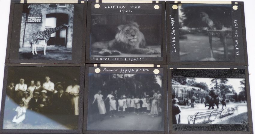A quantity of glass photographic slides to include 1937 Clifton Zoo, Leominster, paddle steamer, machine gunners, Weymouth 1933, Chosen House, military colour examples etc