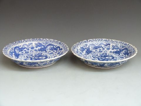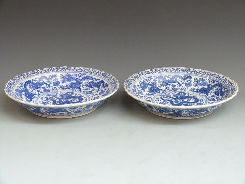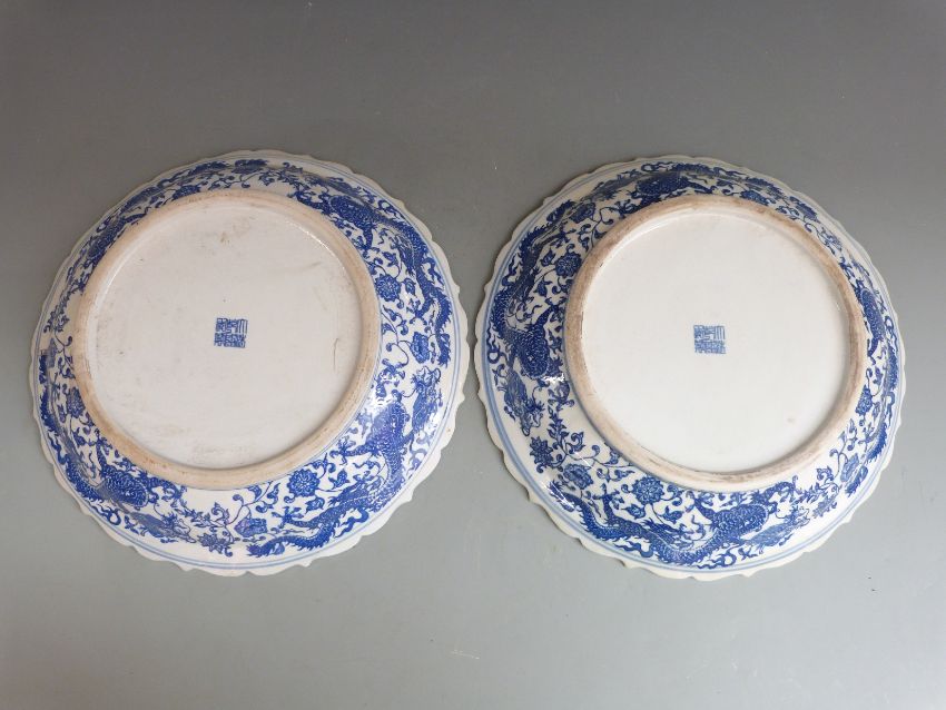 A pair of Chinese blue and white bowls with dragon decoration and Qianlong mark to base, diameter 30cm