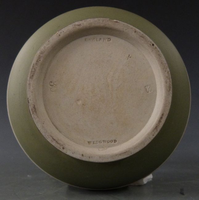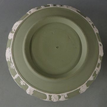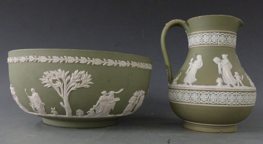 A 19/20thC Wedgwood green Jasperware jug and bowl decorated with classical figures, H16cm, Diameter 20cm