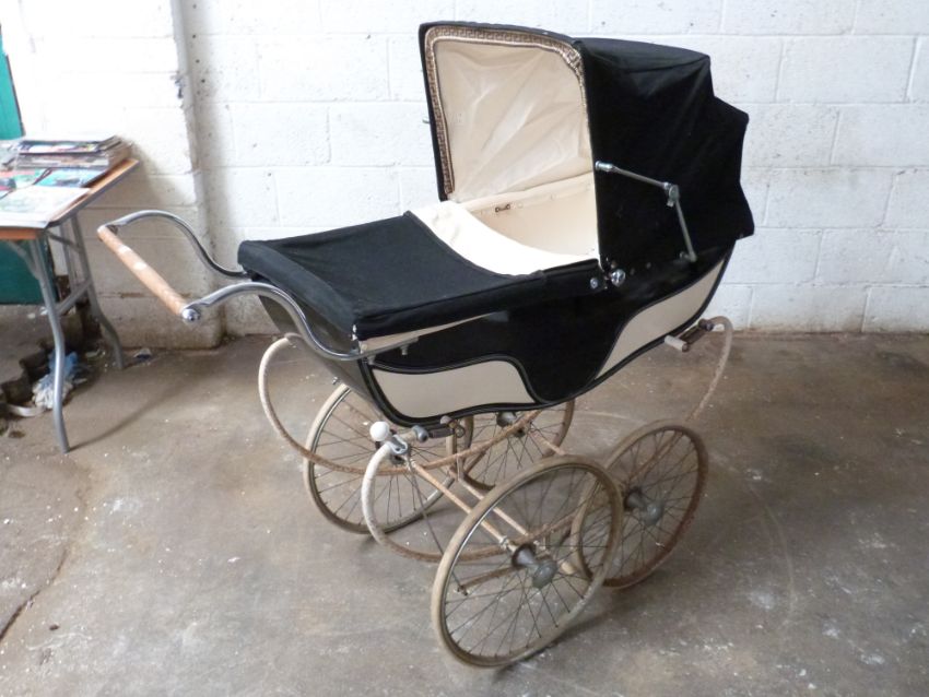 Marmet coach built pram with sprung suspension, navy and cream coachwork and hood, height to handle 97cm