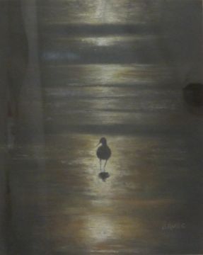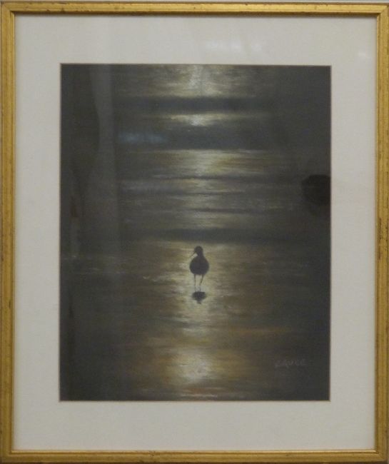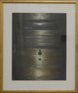 Pastel of a bird silhouetted against a moonlit beach, signed Bruce, 30 x 25cm