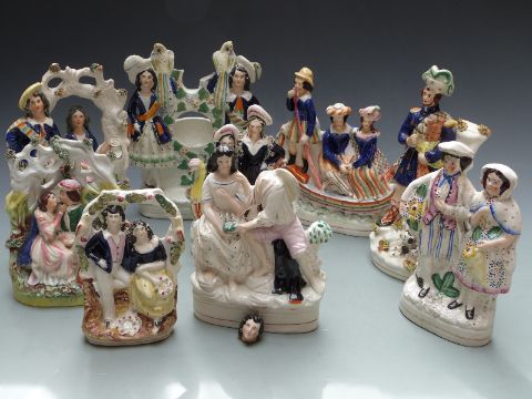 Nine 19thC Staffordshire figures including flatback examples, gondolas, Scottish themes etc, tallest 27cm