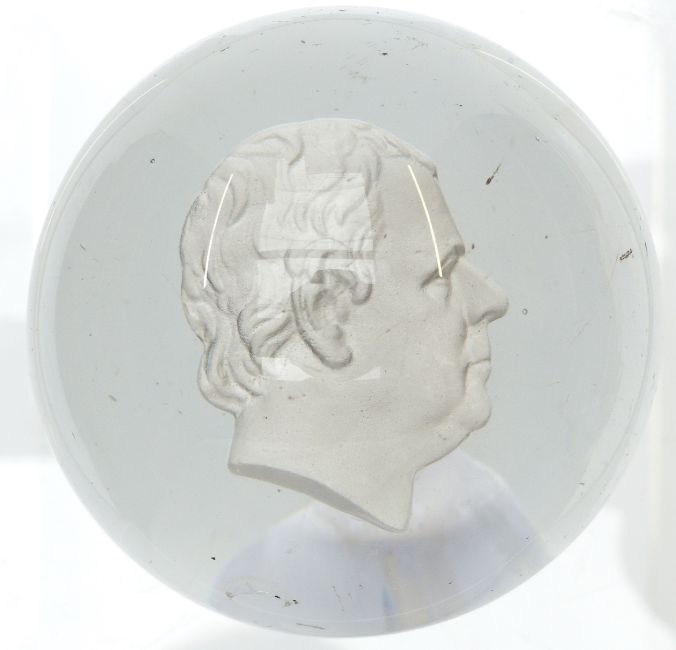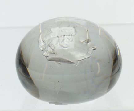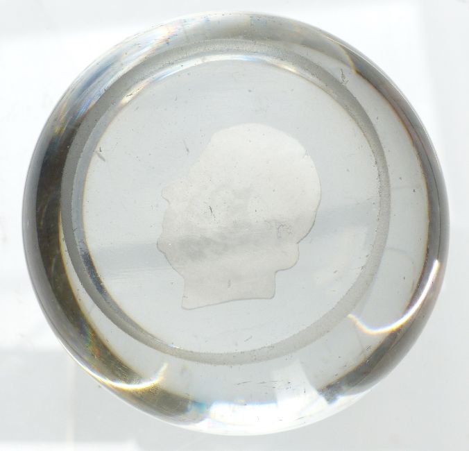 Glass paperweight decorated with a sulphide cameo in the form of King George IV, 69mm in diameter.