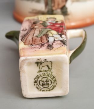 Collection of Royal Dickens Series Ware ceramics, including a rare miniature coffee/tea pot 6cm, pair of vases, cruet, beaker, tankard etc, tallest 11cm