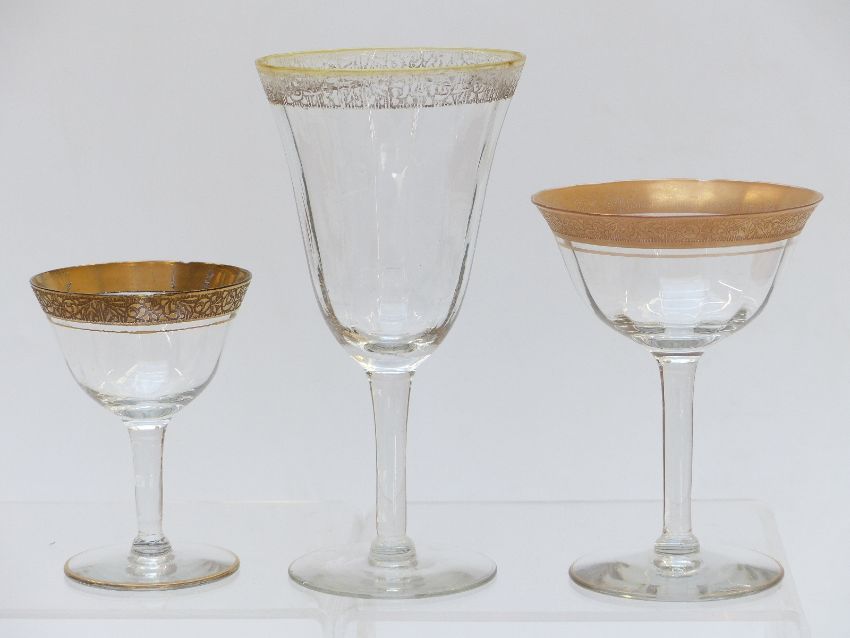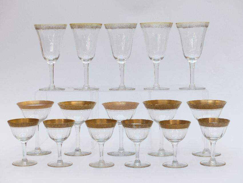 Seventeen Moser drinking glasses, all with floral decoration to the gilt rims and gilt feet, comprising six large wine glasses, five champagne glasses and six liqueur glasses