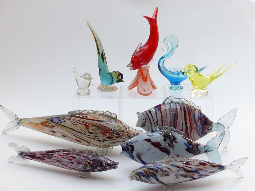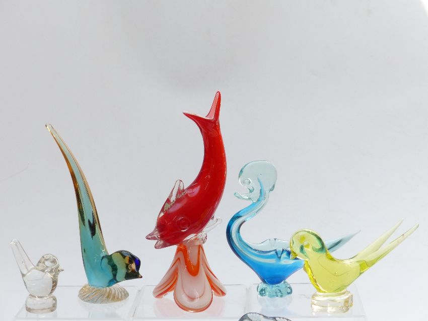 Ten Murano style glass fish and birds with one bird by Liskeard Glass, largest 51cm long
