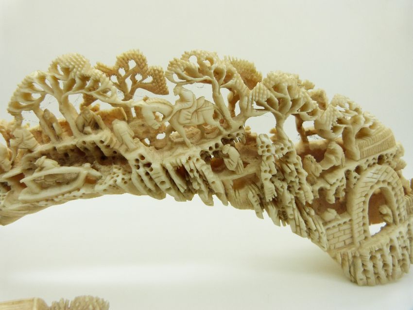 19thC Chinese ivory tusk finely carved with village scenes including buffalo, man on horseback etc L28cm
