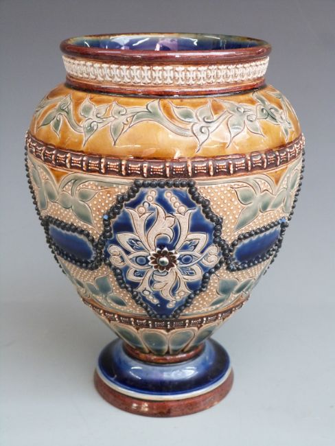 19thC Royal Doulton 19thC pedestal vase with artist's mark for Emma Roberts, H18cm
