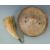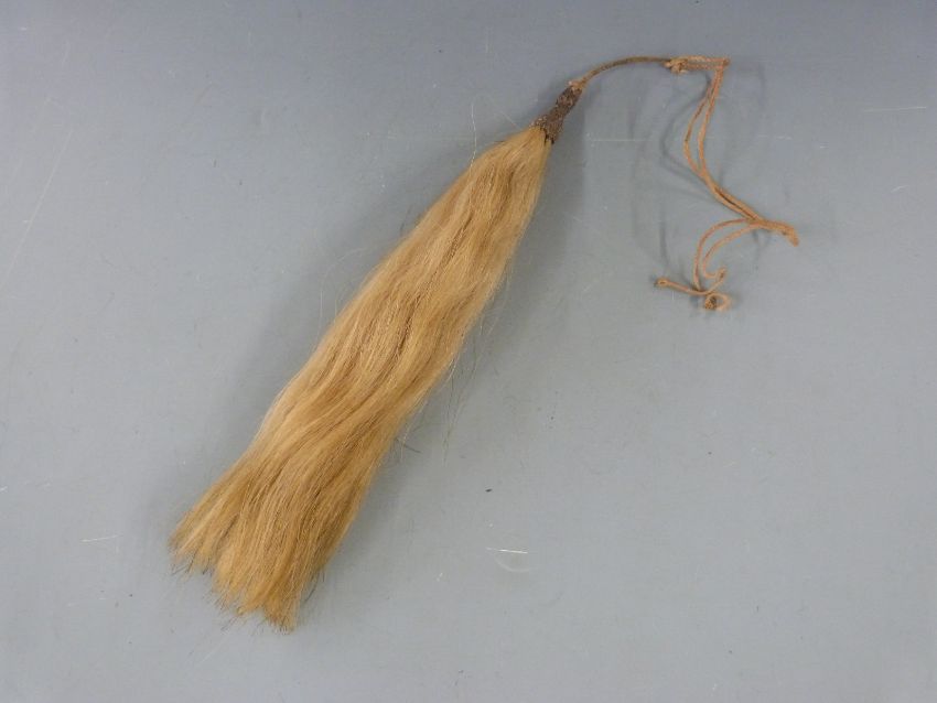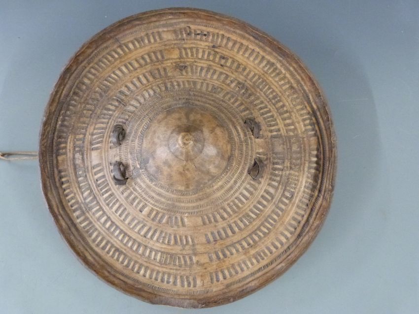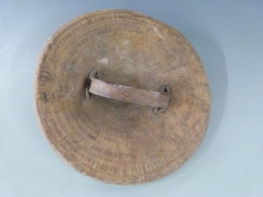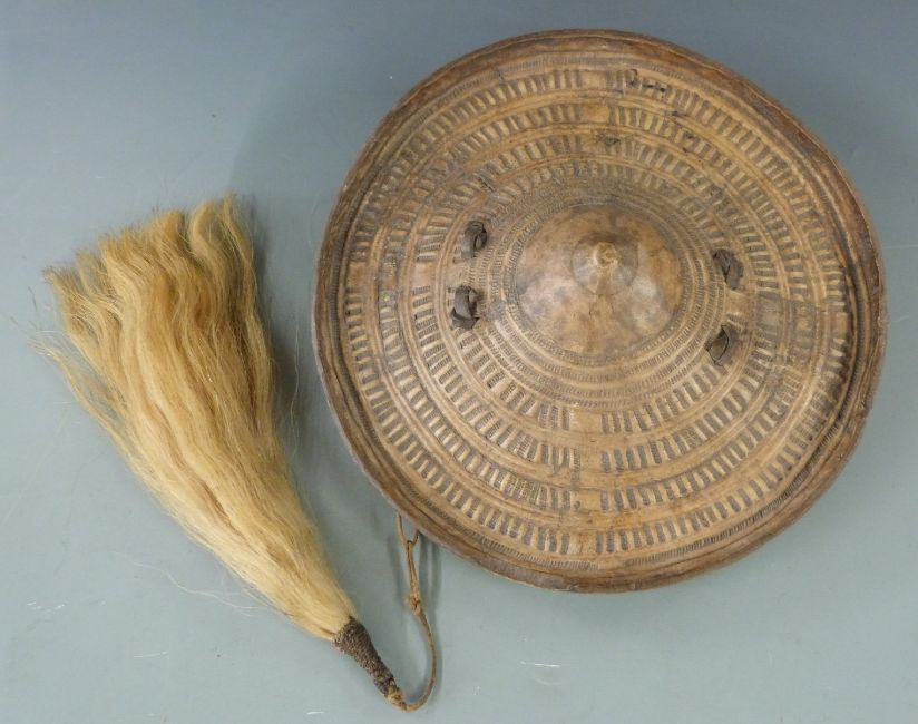 North African tribal leather shield and fly swat, the shield 33cm in diameter