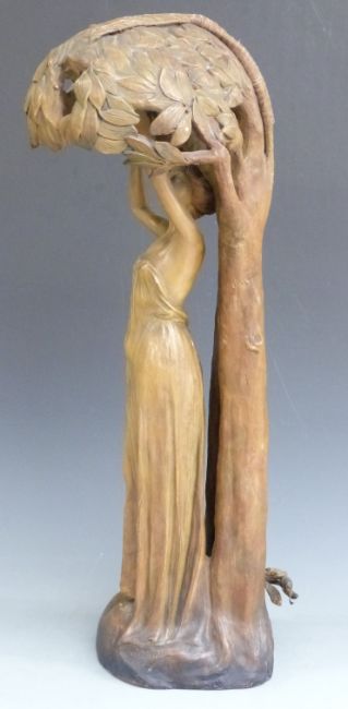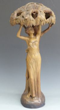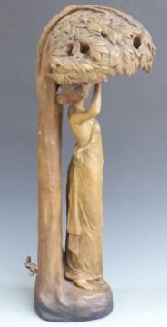 Goldscheider Art Nouveau figural lamp in the form of Eve reaching up into an apple tree. Impressed signature F Gross, shape no 2577, and the numbers 2 and 20 to rear, height 69cm, with four electric bulb fittings to the shade formed by branches of the tree (For similar see Sotheby's 16th November 2006, lot 151)