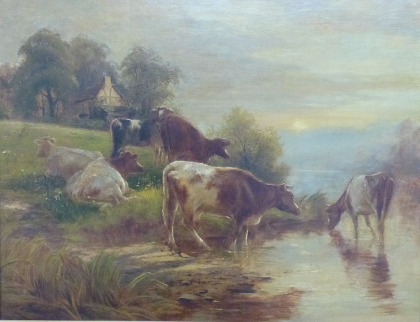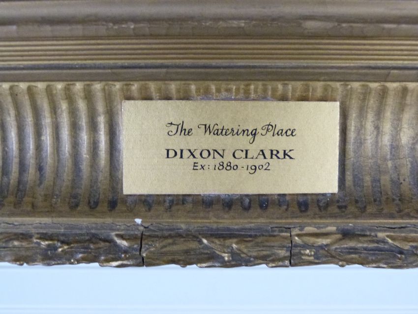 Dixon Clark (Exhibited 1880-1902) oil on canvas 'The Watering Place', cattle with cottage beyond, in ornate gilt frame, 67 x 89cm