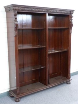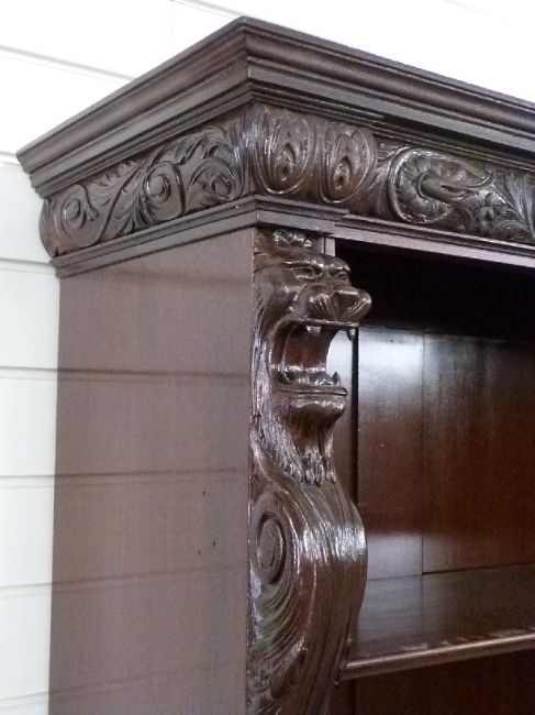 Chinese / Eastern glazed bookcase with adjustable shelving, moulded frieze and lion caryatids, W166 x D38 x H188cm