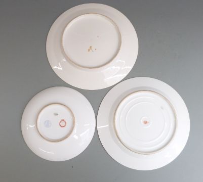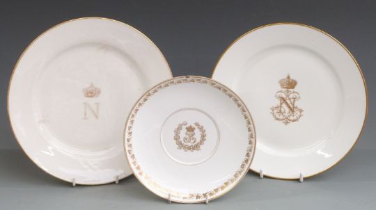 Sevres 19thC porcelain Napoleon III dinner service plate, one other with gilding rubbed and a saucer for Chateau Des Toileries, diameter 26cm