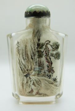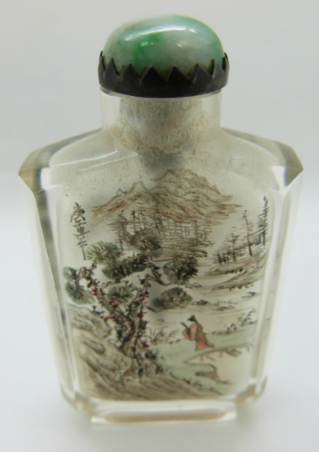 A Chinese reverse painted glass scent bottle with a jadeite cabochon to the stopper, 8.5cm tall