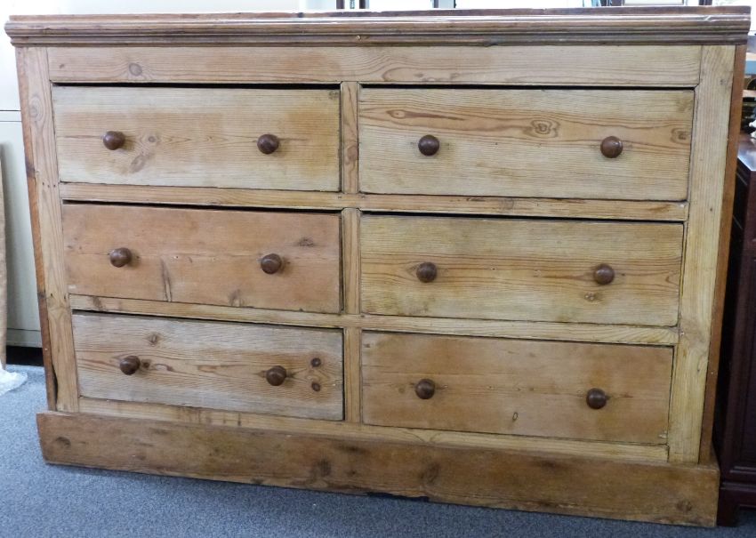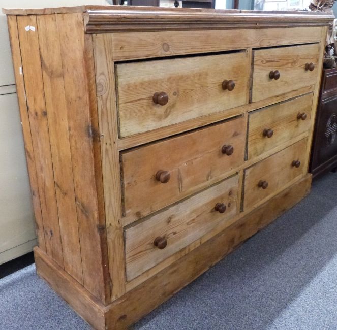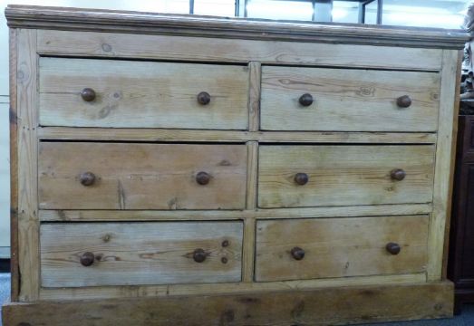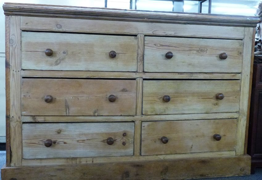 A 19th/20thC pine chest of six straight drawers with turned knobs, raised on a straight plank plinth, W160 x D54 x H110cm