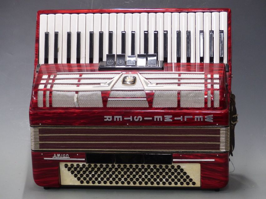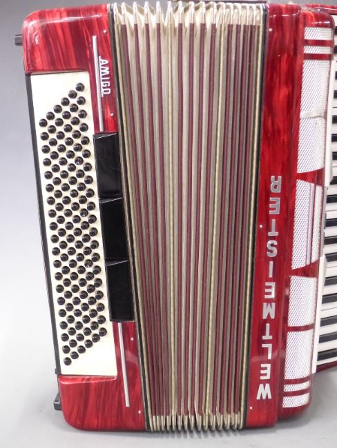 Weltmeister Amigo 120 bass piano accordion with 5 treble and 3 bass couplers in red pearloid finish, with hard carry case