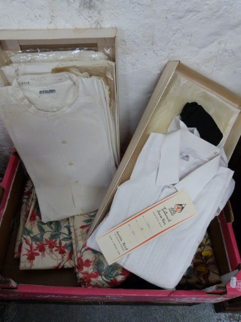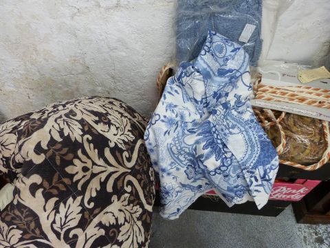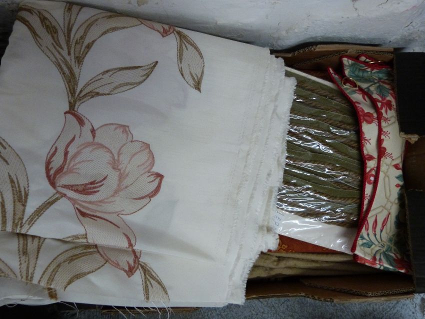 Four boxes of mainly curtain fabric, backing, rolls of hanging header, tassels, ropes, tiebacks and accessories etc